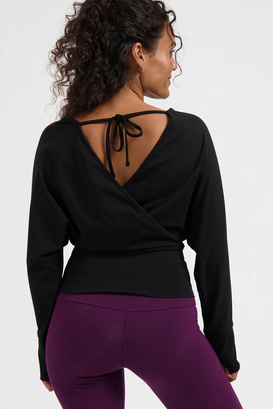 The Ala Cotton Yoga Long Sleeve is a soft and feminine wrap top with batwing sleeves, a deep V-neck, and an open back with a tie strap. Made from organic cotton with a touch of Lycra for extra comfort and freedom of movement. Ideal for layering over your yoga bra, during gentle practices, or simply for relaxing. The Ala Cotton Yoga Long Sleeve is a stylish and versatile layering top with a relaxed fit and refined feminine details. Made from organic cotton and Lycra, this long-sleeved top feels soft and breathable, with just the right amount of stretch.