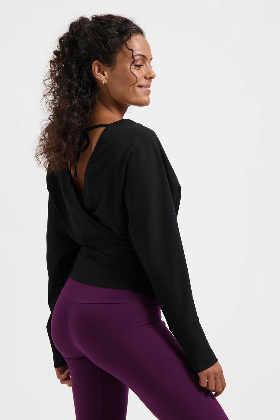 What makes the Ala top so special? The open back with crisscross tie straps adds a subtle feminine touch. The deep V-neckline at the front makes this long-sleeved top ideal for wearing over a yoga bra or fitted top. The wide waistband ensures the top stays in place, perfect for Pilates and yoga.