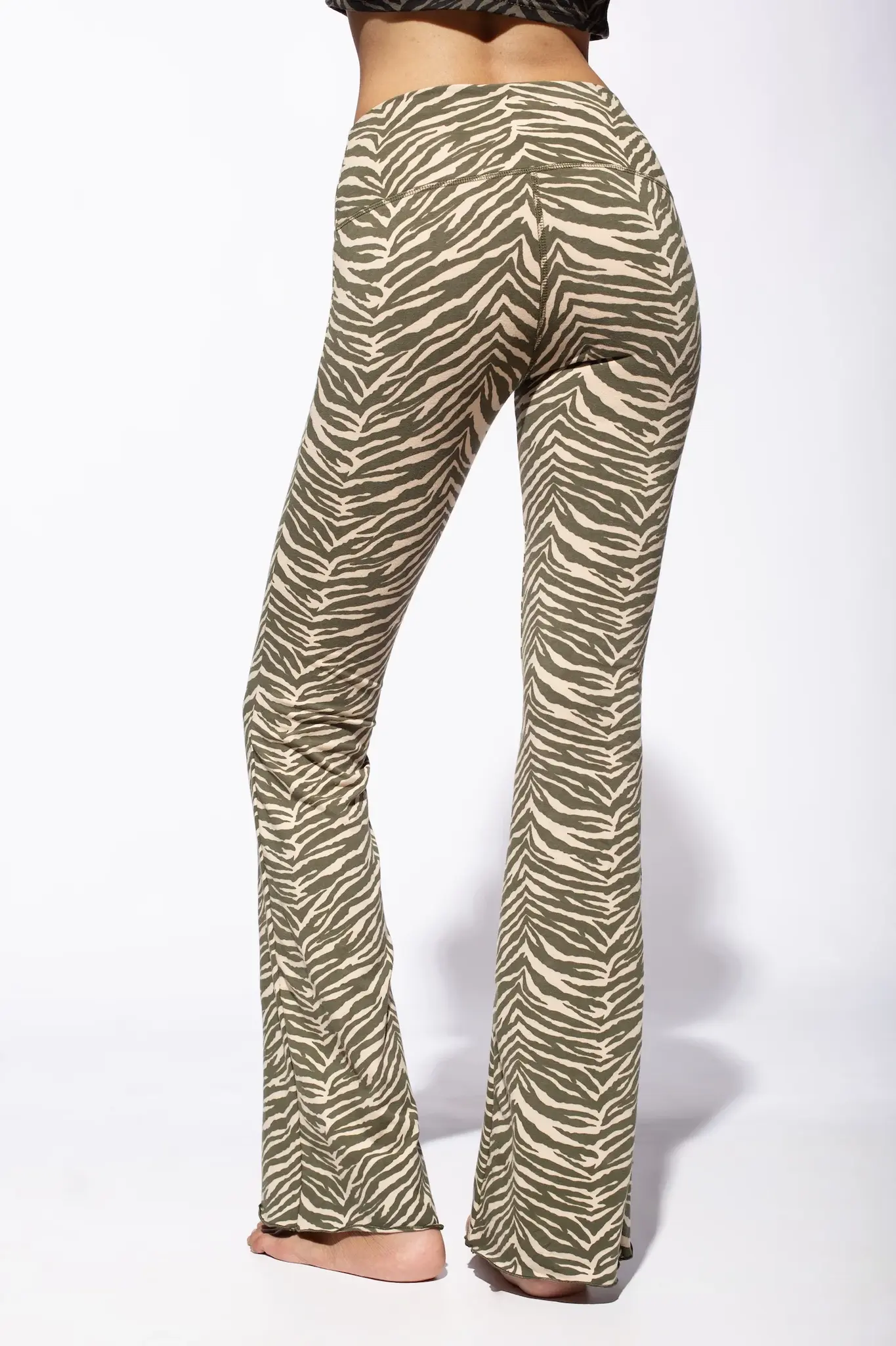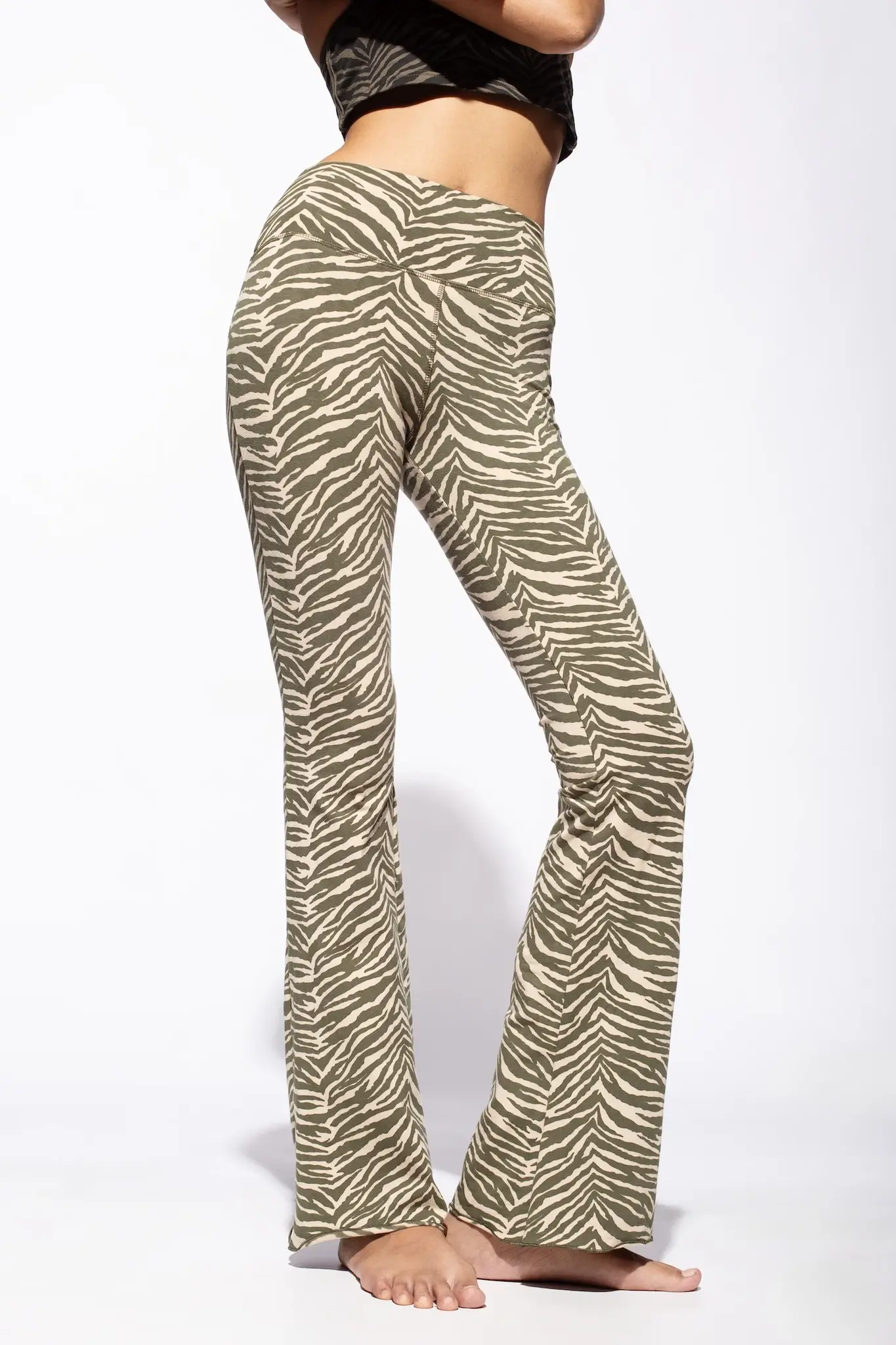 This pair of original bootleg leggings come in a cream/olive zebra print with a flare starting just by the knee. Our yoga flares are perfect to stretch in as the high-quality cotton spandex moves and moves with your body. No more worrying about your leggings getting baggy at the bum or knees, their 4-way stretch means that they hug your figure at all times.