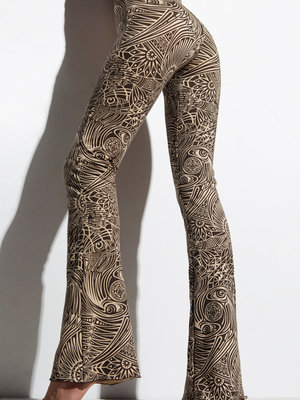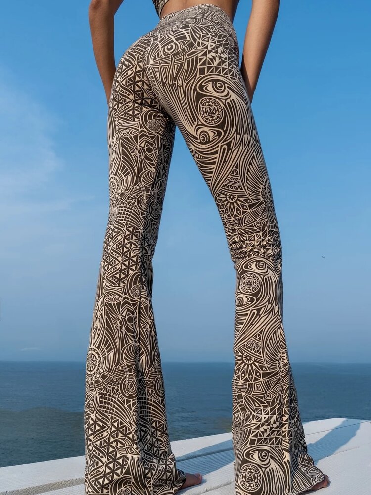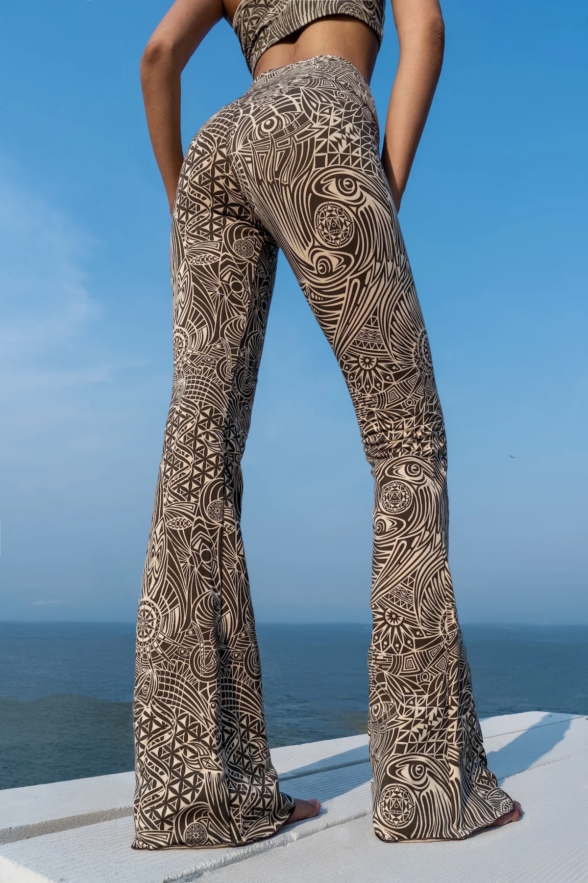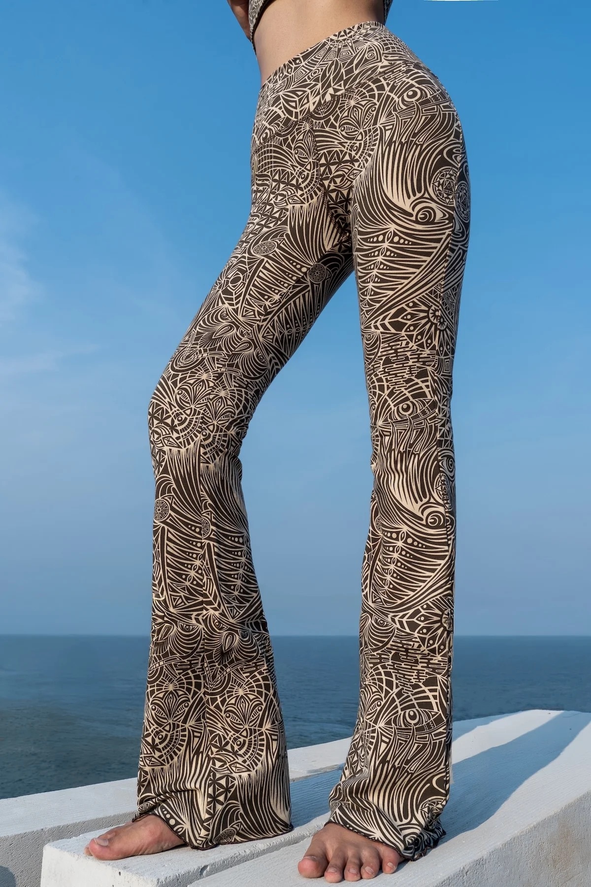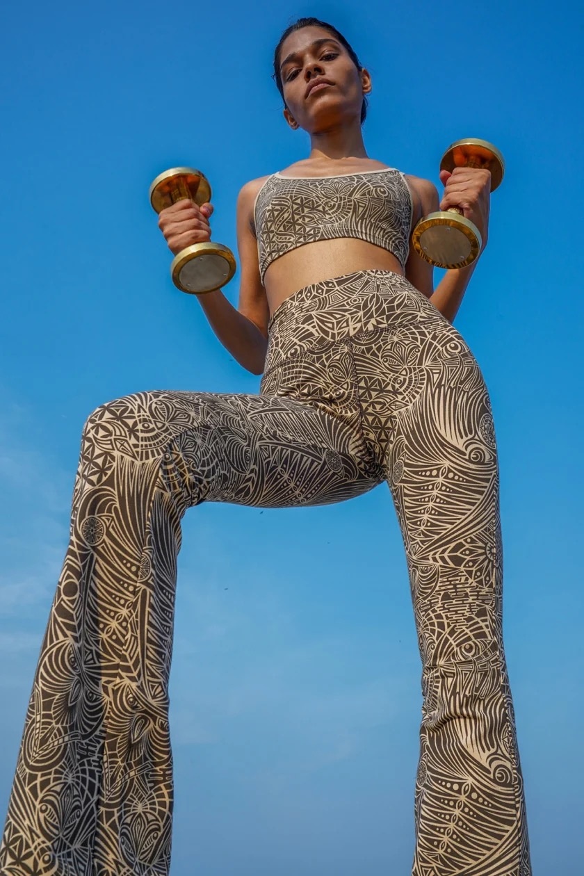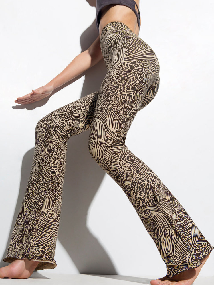 This pair of original bootleg leggings come in a cream/brown tribal print with a flare starting just by the knee. Our yoga flares are perfect to stretch in as the high-quality cotton spandex moves and moves with your body. No more worrying about your leggings getting baggy at the bum or knees, their 4-way stretch means that they hug your figure at all times.