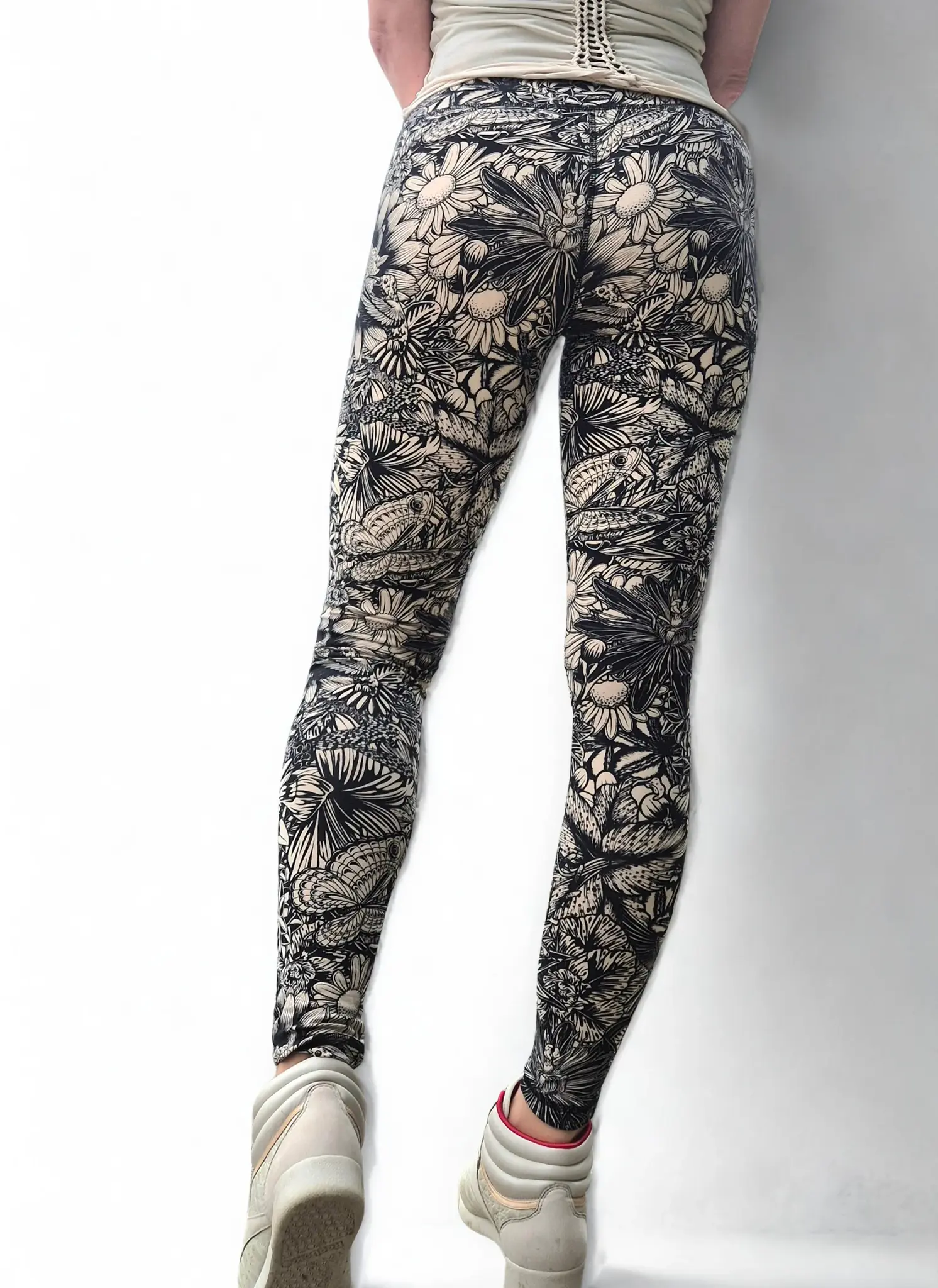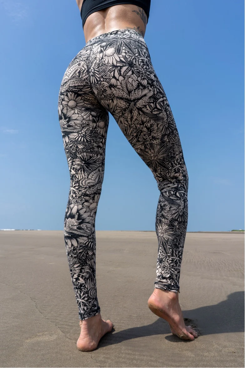 High Waisted Cream Leggings with our Black Bloom print. These have a wide band that sits very comfortably around your waist. You can fold over the band as well, to make your waist-line at the exact height you prefer. And keep your love handles in check.