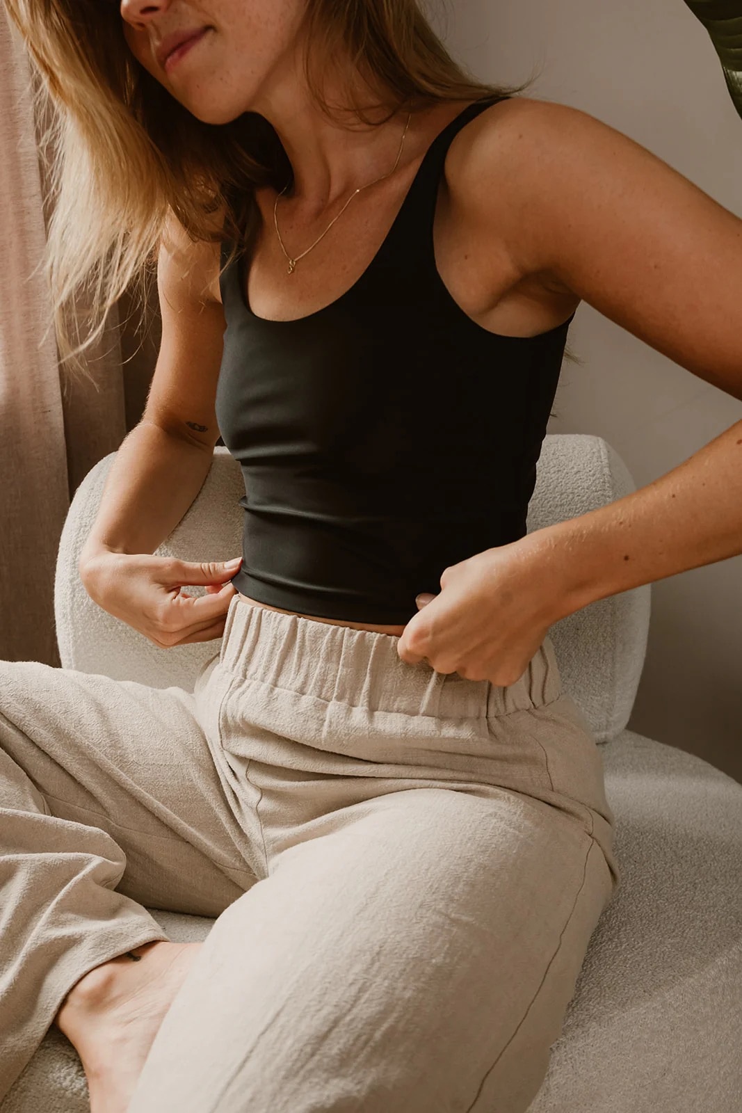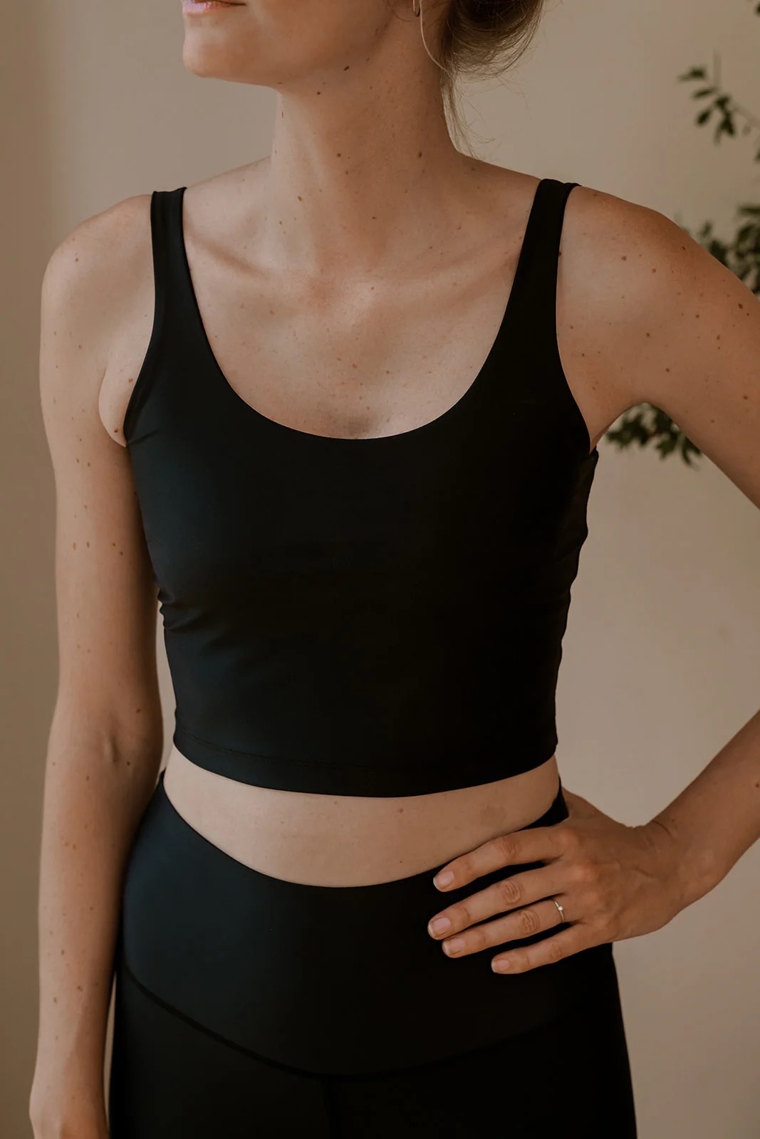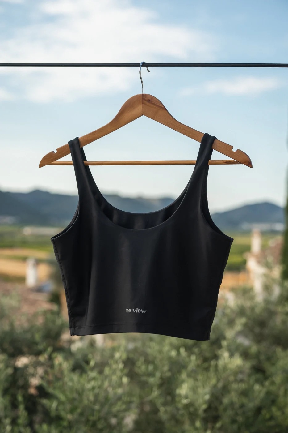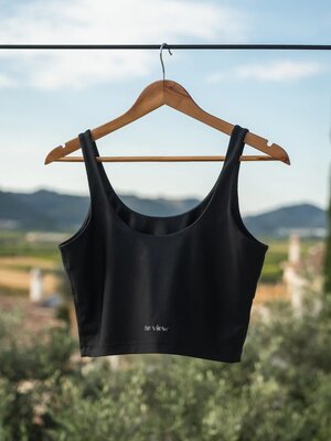 Cropped top with extra bra layer inside. Developed for yoga and other soft sport activities. We also highly recommend the top to be worn with a skirt or pants on hot summer days or for hikes in nature.