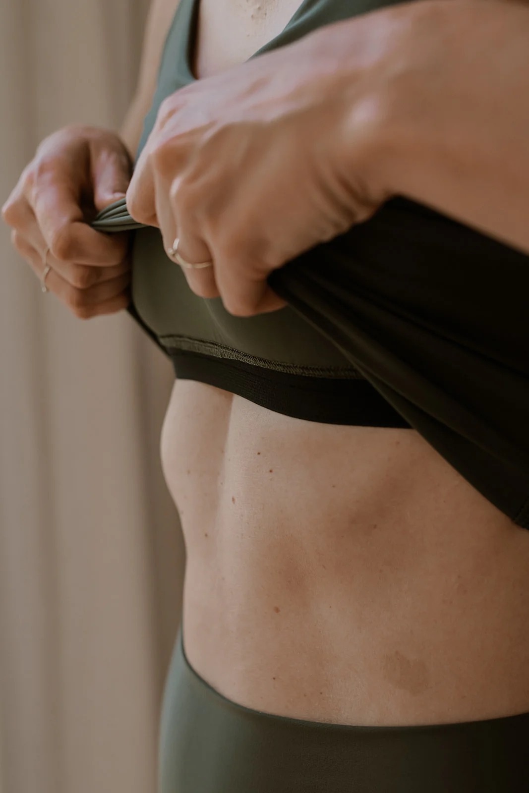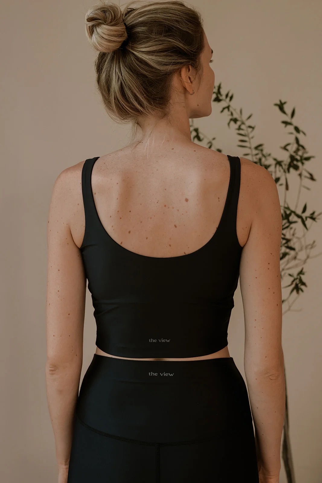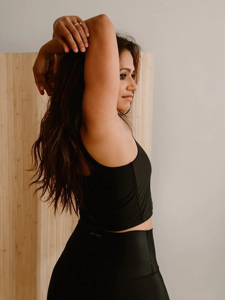 Cropped top with extra bra layer inside. Developed for yoga and other soft sport activities. We also highly recommend the top to be worn with a skirt or pants on hot summer days or for hikes in nature.