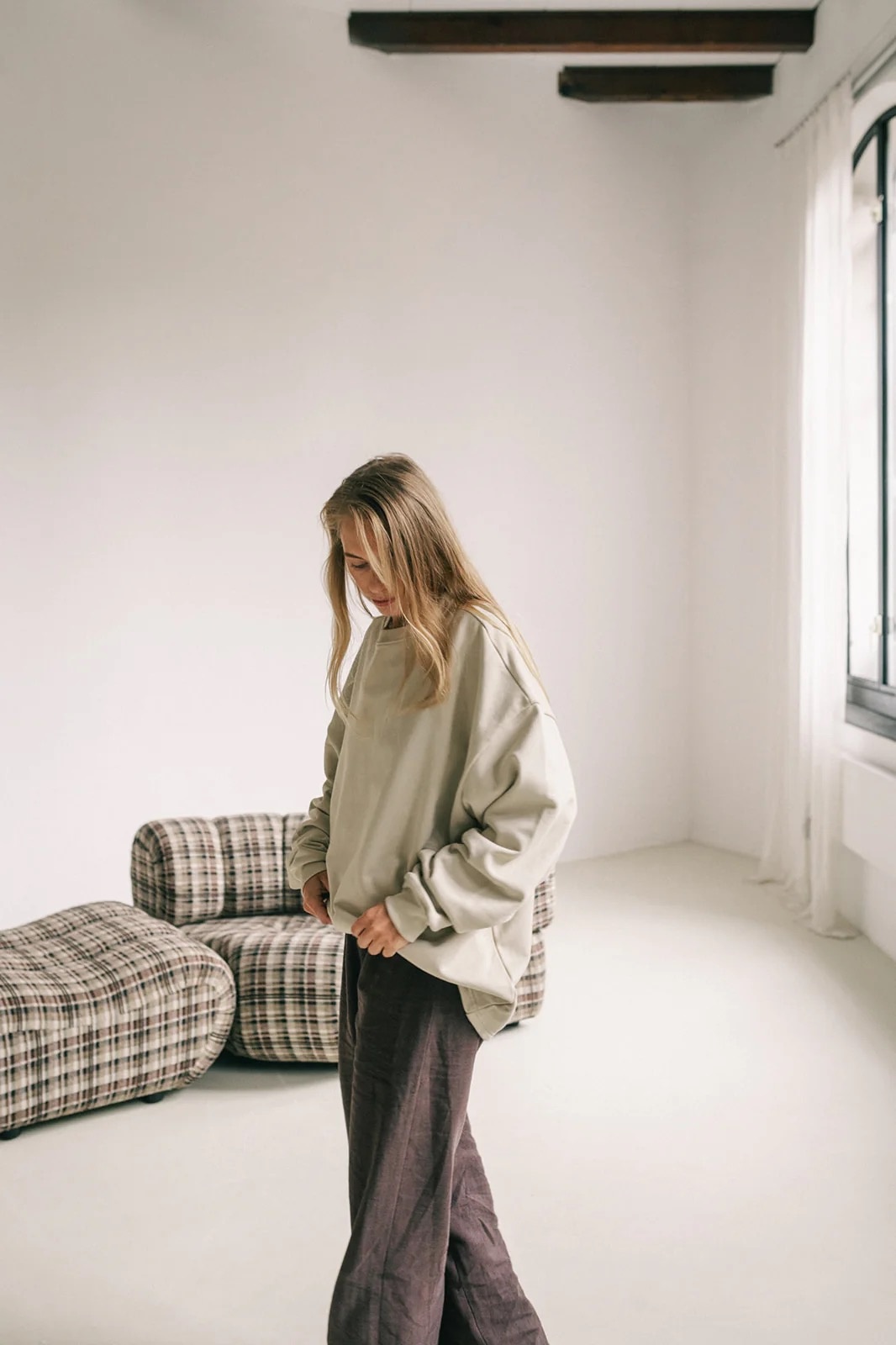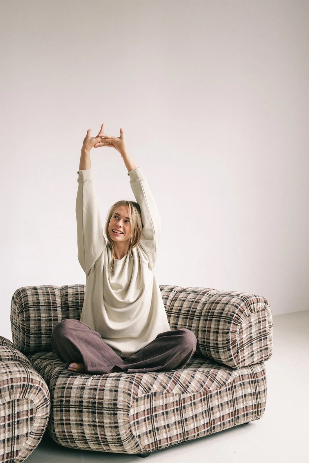 Made from 100% organic cotton. The fabric is nice and heavy and the sleeves are made extra long. Perfect for wearing over your yoga outfit and during savasana. We offer this sweater only in one size, but we are sure it fits you (and your partner).