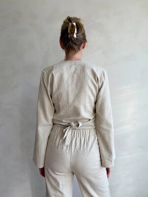 Sometimes, you just want a top with long sleeves. This linen wrap top is light and breathable, made from soft fabric that feels comfortable against the skin. The wrap design allows you to wear it in different ways, adapting to your own style and comfort.