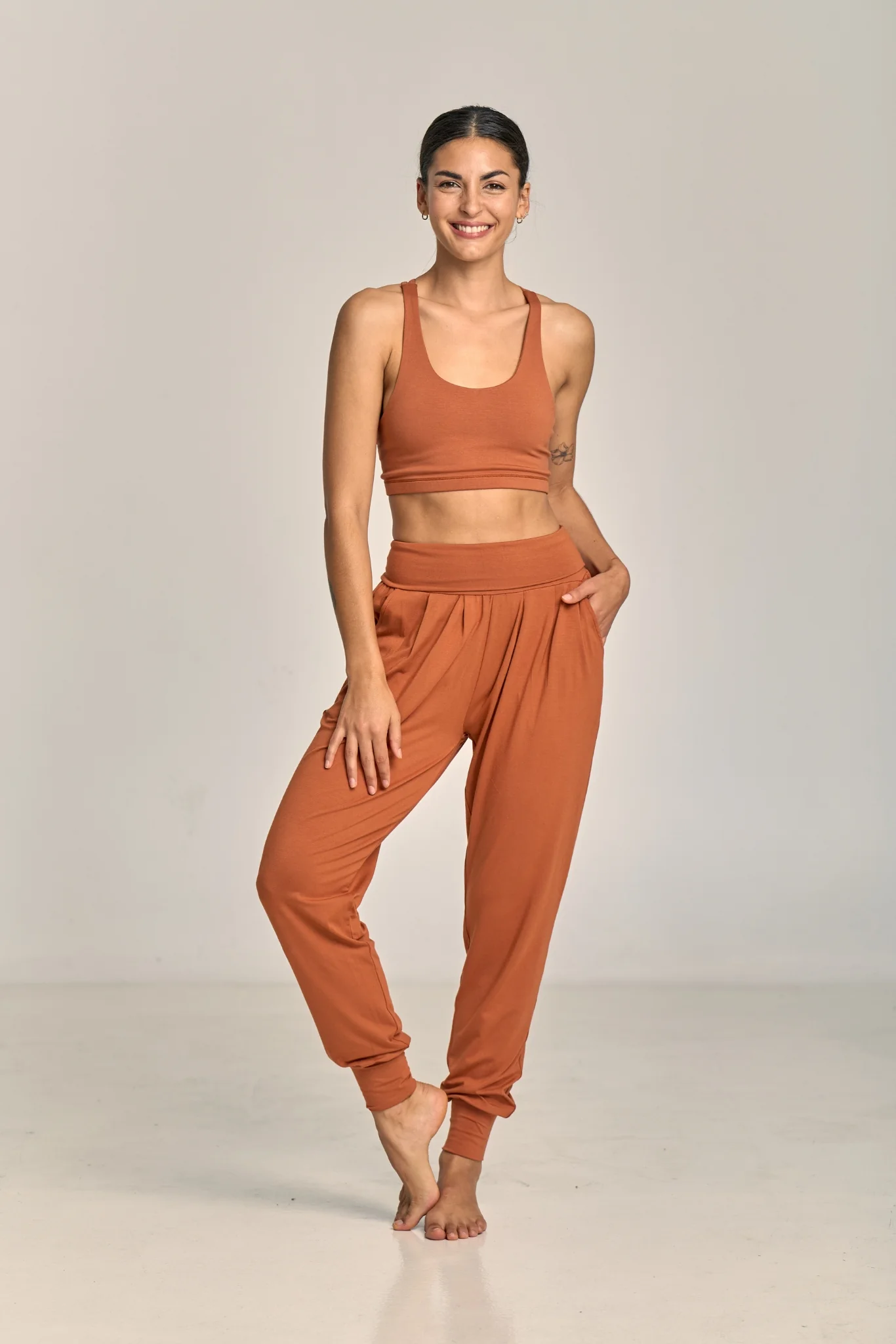 Experience the perfect fusion of comfort, sustainability, and performance with our Organic Cotton & Modal fabric blend. Organic cotton offers a natural feel that's durable and breathable. It's complemented by Modal, providing a silky smooth texture, softness, and effective moisture management for your yoga practice. Our modal is sourced from Lenzing, a global leader in sustainable fiber production. The addition of elastane ensures flexibility for a full range of yoga poses. Elevate your yoga practice with this ethically produced fabric blend, designed to enhance your well-being and connection to nature.