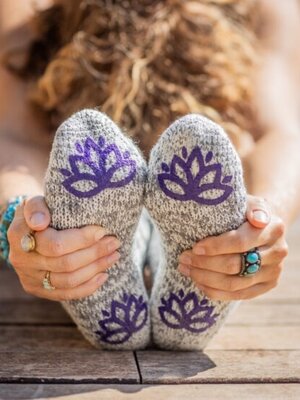 Let yourself be seduced by the beauty of our Mystical Purple label. These sheepskin socks are available in unisex and feature a lotus flower-shaped anti-slip sole. The grip sole makes these anti-slip socks ideal for yoga or Pilates and provides extra stability and balance on the mat. So don't be distracted by slips and cold feet during your yoga session with these wonderfully warm yoga socks!