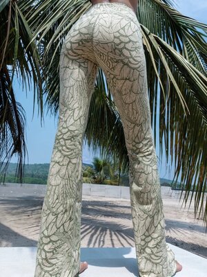 De flare legging heeft een cream/olive green feather print. Ze zijn perfect om in te stretchen, omdat de hoogwaardige katoenen spandex met je lichaam meebeweegt. Je hoeft je geen zorgen meer te maken dat je leggings baggy worden bij de billen of knieën, hun 4-way stretch betekent dat ze je figuur te allen tijde omhelzen.