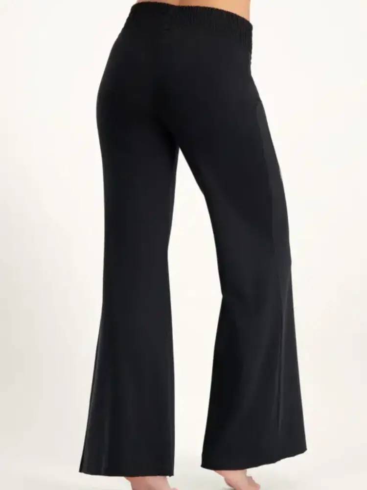 Het model is 1,65 m en draagt deze wijde yoga broek in maat S. De binnenbeenlengte van deze broek is 81 cm voor XS en S en 83 cm voor de andere maten.