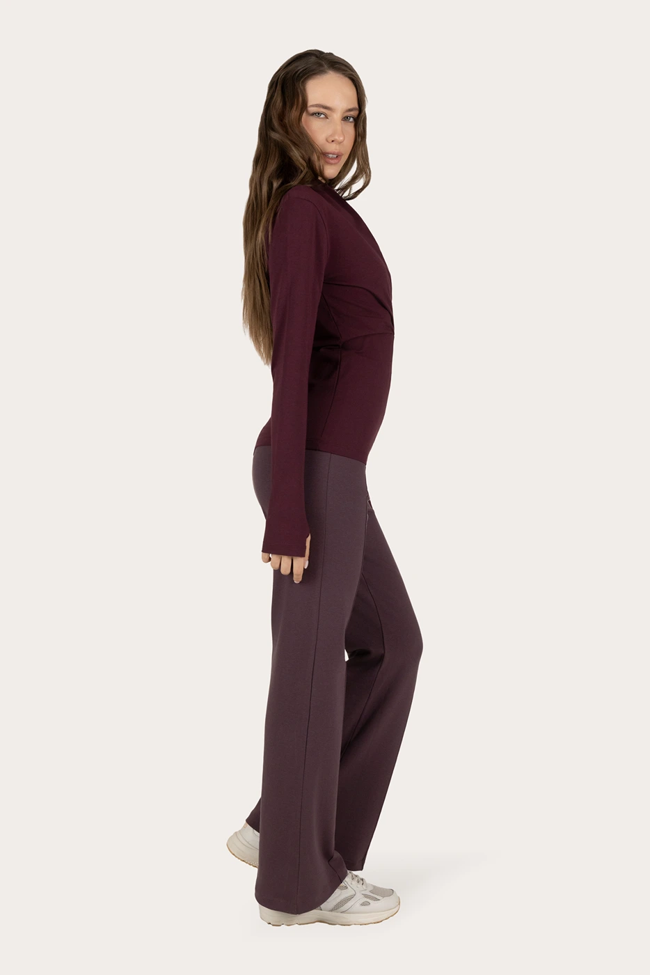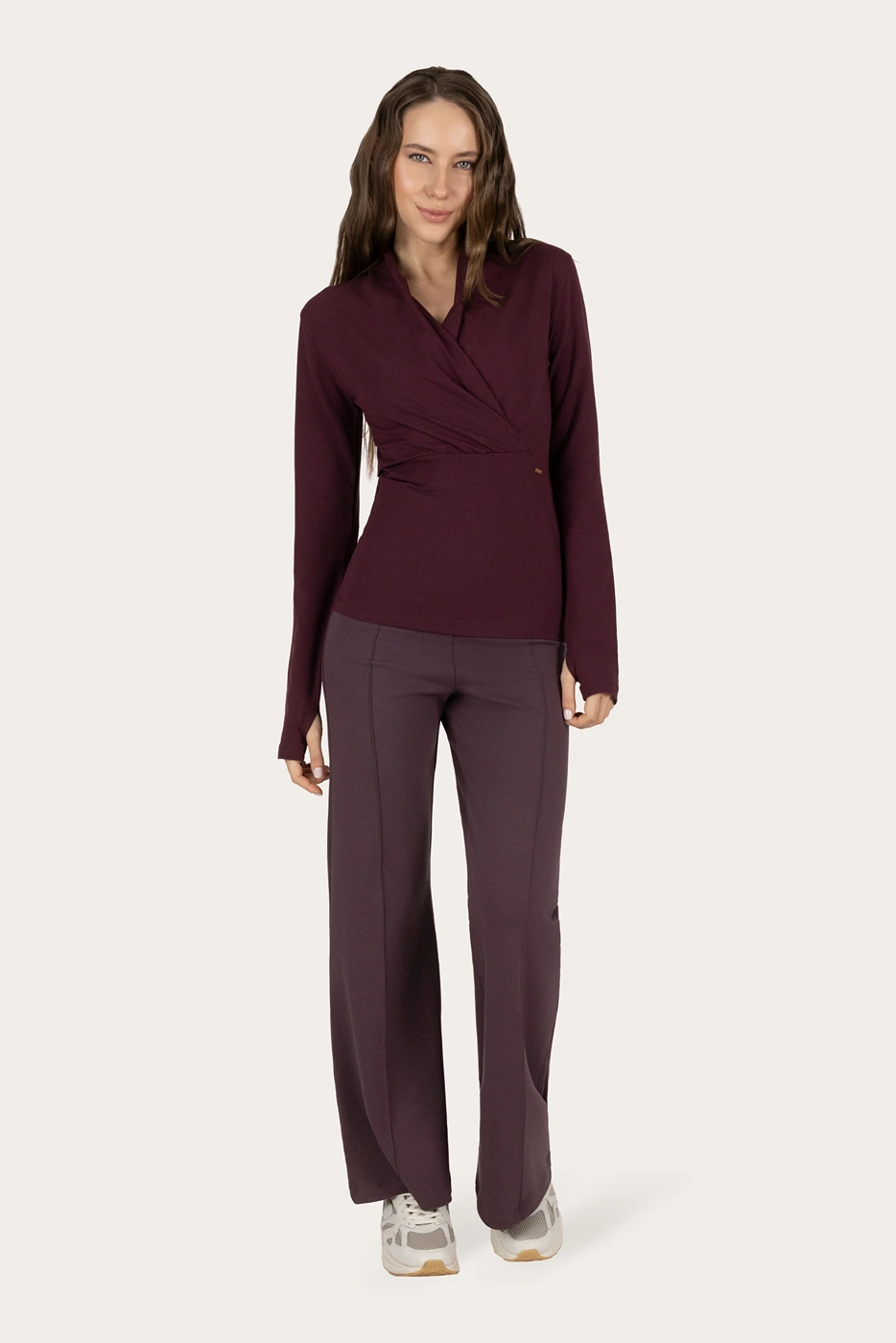 Het model is 1,72 m en draagt de Ishtar duurzame yoga long sleeve top in maat S.