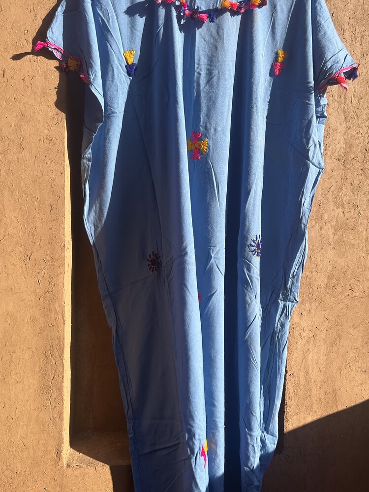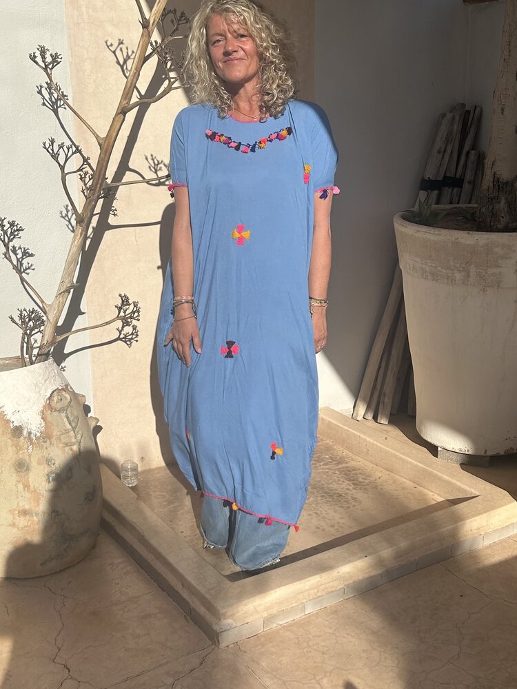 Lange wijde jurk met geborduurde figuren en kwastjes gemaakt door Marokkaanse vrouwen uit de dorpen rondom de Merzouga woestijn. Handgemaakt met liefde en expertise door getalenteerde vrouwen. Met zijn duurzame en eerlijke manier van handel is deze jurk een bewijs van ethische mode die zich onderscheidt van de massa.