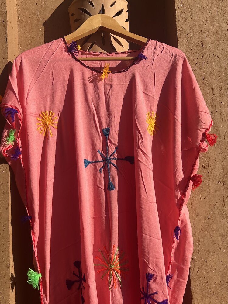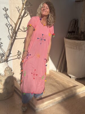 Lange wijde jurk met geborduurde figuren en kwastjes gemaakt door Marokkaanse vrouwen uit de dorpen rondom de Merzouga woestijn. Handgemaakt met liefde en expertise door getalenteerde vrouwen. Met zijn duurzame en eerlijke manier van handel is deze jurk een bewijs van ethische mode die zich onderscheidt van de massa.