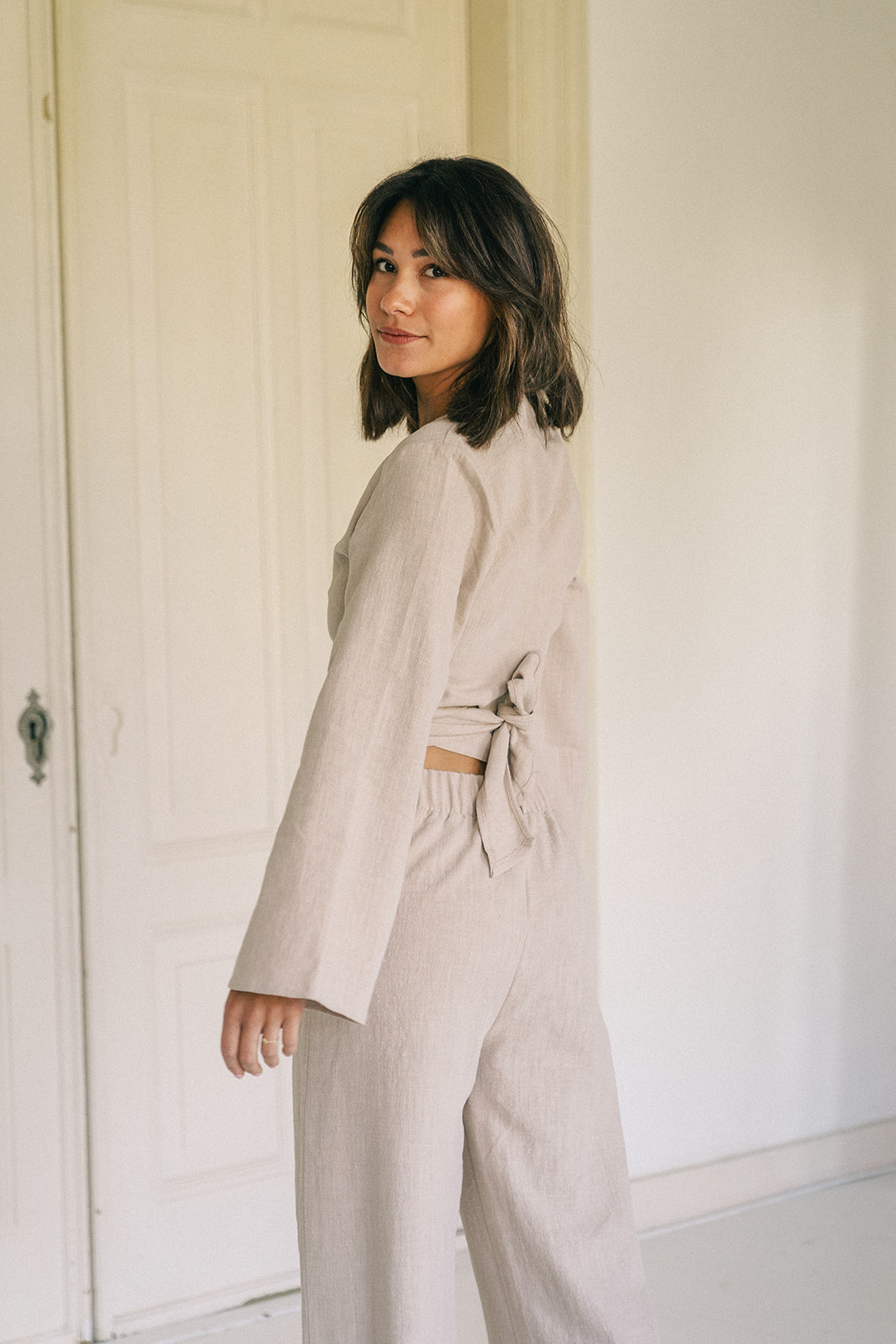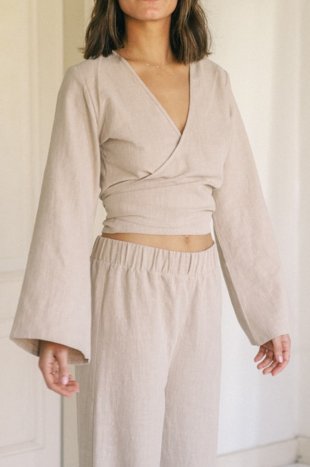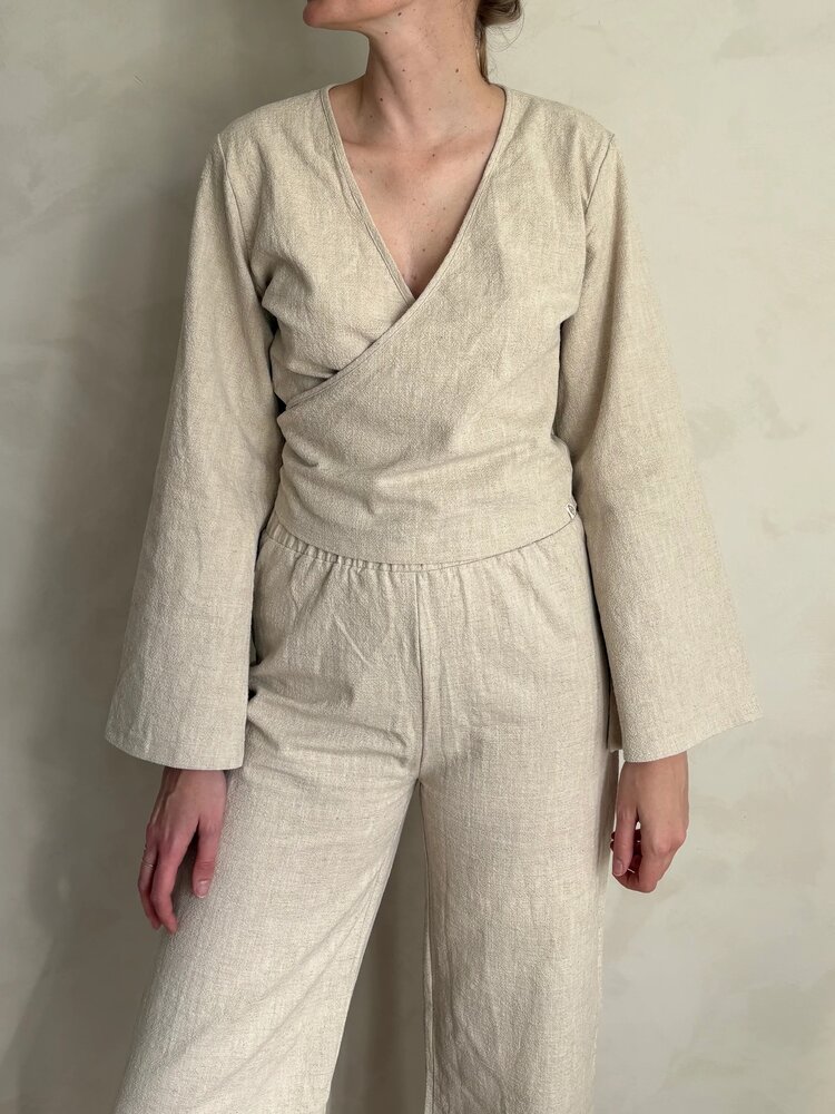 Soms wil je gewoon een top met lange mouwen. Deze linnen wikkeltop is licht en ademend, gemaakt van zachte stof die comfortabel aanvoelt op de huid. Het wikkelontwerp zorgt ervoor dat je hem op verschillende manieren kunt dragen, aangepast aan je eigen stijl en comfort.