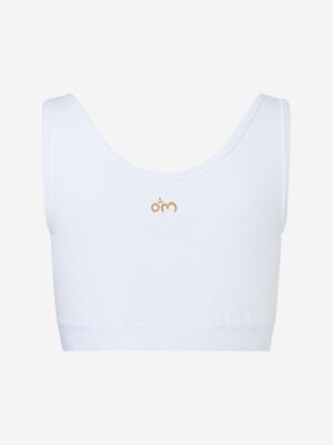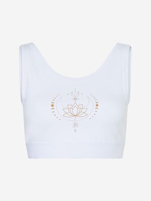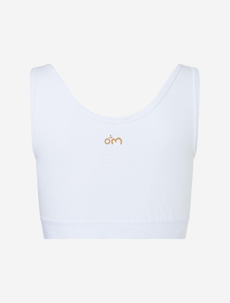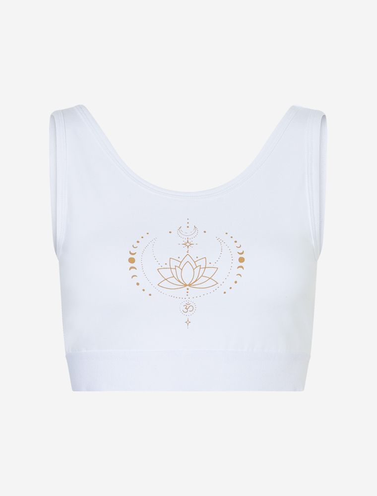 Deze beha is een ongecompliceerde basic die je keer op keer met plezier zult dragen – voor yoga, in het dagelijks leven of als comfortabele laag onder je favoriete outfits. Hij zit comfortabel tegen het lichaam, heeft geen cups en ziet er daardoor bijzonder strak en natuurlijk uit. Een hoogtepunt is de gouden "Eka Padma"-print op de borst, die een subtiel accent aan het ontwerp toevoegt zonder te overheersen. De beha is verkrijgbaar in zwart en wit – beide versies zijn gemakkelijk te combineren en passen bij vrijwel alles.